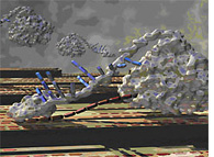 The enzyme complex cellulase breaks down cellulose, the main component of plants, with an apparent two part process. The "head" in the "front" pulls up strands of cellulose, which are ingested into the main "body" of the enzyme and digested into smaller pieces. J. Brady, M. Himmel, L. Zhong, M. Crowley, C. Brooks III, and M. Nimlos. |