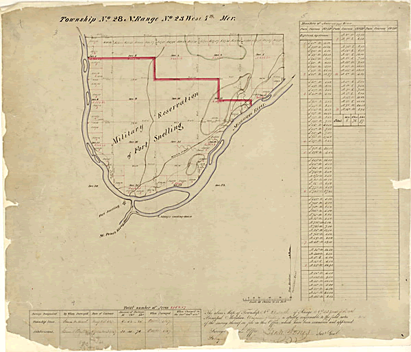 Digital image of original plat map for the area of Fort Snelling in Ramsey County, Township 28 North, Range 23 West. This 1820s military outpost, once the focus of a small settlement at the confluence of the Mississippi and Minnesota rivers, is now near the center of Minnesota's Twin Cities metropolitan area. Minnesota Historical Society T028r23w4fi04.