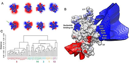 (A) Electrostatic properties of the kinesin family. Electrostatic properties of different kinesin representatives are expressed as a color spectrum ranging from positive (blue) to negative (red). (B) A consensus electrostatic potential map of the kinesin family illustrating conserved charged regions. Note the consistent positive blue patch on the rear face of the protein which binds microtubules. (C) Electrostatic clustering of available kinesin structures groups functionally similar proteins. See PLoS research article for more details. |