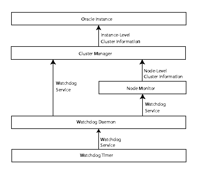Figure E-1 shows how the Watchdog daemon provides services to the Cluster Manager and to the Node Monitor. The Node Monitor passes node-level cluster information to the Cluster Manager. The Cluster Manager passes instance-level cluster information to the Oracle instance.