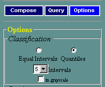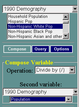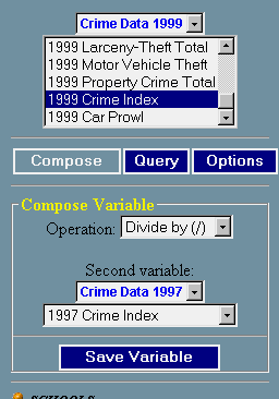 Click on a variable in the box you see at the top of the left frame. The map to the right will display colors reflecting this variable's values and a legend box will appear. Click another variable, and the map coloring will immediately reflect that variable's values.