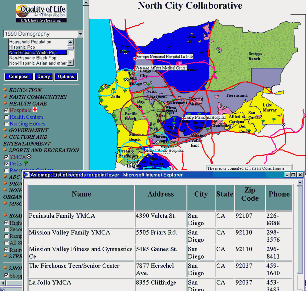 Displaying an attribute table for selected area unitsOpen the Query dialog form, choose "Select All" form the drop-down box, and click "Listing". A table containing all records and variables in the currently selected dataset, will display in a new browser window. If you want to display attributes for selected records only, first select these records using query options (as described in the "Building Queries" page, and click "Listing". |