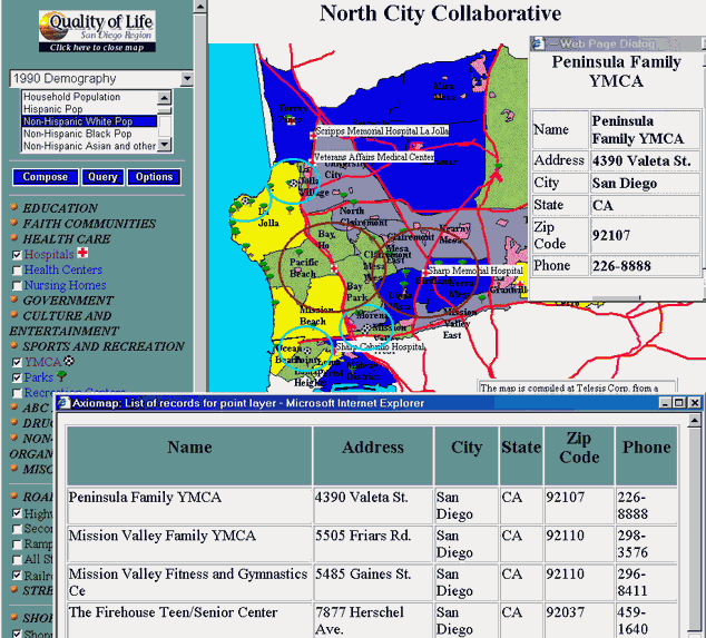 There are two ways to examine characteristics of point symbols in AxioMap . Displaying an attribute table for point layer objectsClick on the name of the layer in the left frame, and a table with all attributes of layer objects will open in a new browser window. For this, you don't have to render the layer on the map. You can save the table as an HTML file (right-mouse-click on the table, select "View Source", and save the source file), and then import it into Excel or other spreadsheets for editing. Or, you can print out this table (right-mouse-click on the table, and choose Print). Below is an example of this type of table overlaid on a map.