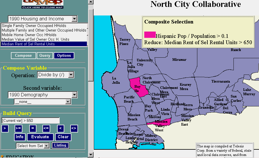 Composite QueriesComposite queries are essentially a sequence of simple queries. Once your first simple query selects several records, you can limit or increase this selection set using variables (from the same or a different dataset, or derived variables). Just map another variable, and choose "Select from set" or "Add to set" before clicking "Evaluate". For example, to select neighborhoods with Median Rent over $650 from the 9 neighborhoods selected above, switch to "1990 Housing and Income" dataset and select the "Median Rent of Sel Rental Units" variable (make sure that you are not dividing it by the Population variable from the previous query). Then enter "[Current var] > 650"as the query expression. Choose "Select from Set" from the drop-down box, and click Evaluate. The query and results are shown below: