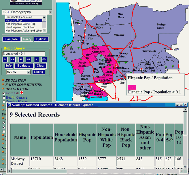 You can select areas with certain values, or a specified combination of values, isong the query options. Selected areas will be highlighted on the map. You can also generate a list of selected areas with their attributes.